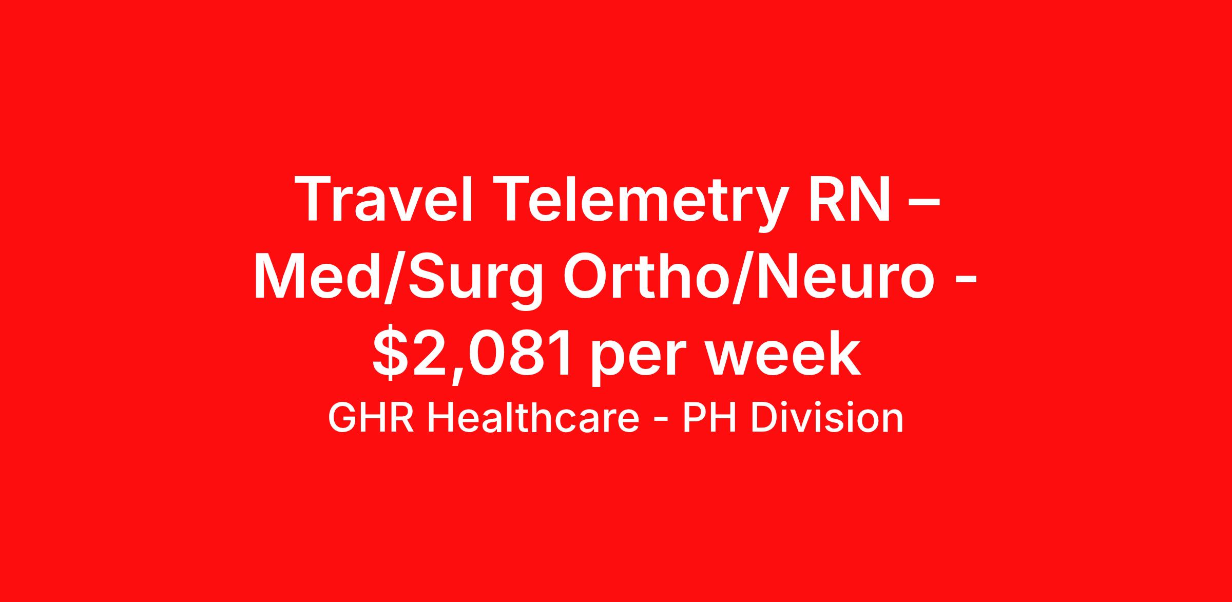 GHR Healthcare - PH Division is seeking a travel nurse RN Telemetry Med Surg for a travel nursing job in Salem, Massachusetts. Job Description & Requirements Specialty: Telemetry Discipline: RN Start Date: 04/19/2026 Duration: 12 weeks 36 hours per week Shift: 12 hours Employment Type: Travel Planet Healthcare Job ID 76211942. Pay package is based on 12 hour shifts and 36 hours per week (subject to confirmation) with tax-free stipend amount to be determined. About GHR Healthcare - PH Division For over 30 years, GHR Healthcare has been the bridge between healthcare professionals and the facilities that need them nationwide. We're committed to uncovering your ideal fit, supported by GHR's dedication to competitive compensation, transparent communication, and a devoted team that genuinely cares about your career journey. You can trust us to stand by your side as your advocate, confidante, and partner in advancing your career. At GHR, care and consideration are at the heart of everything we do. Visit ghrhealthcare.com to learn more.