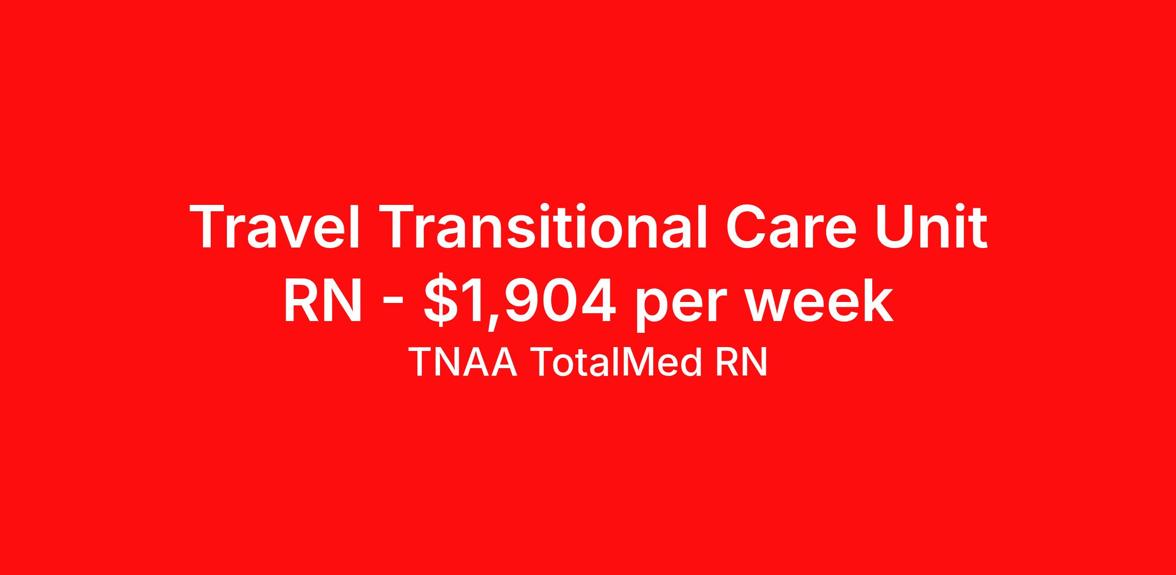 TNAA TotalMed RN is seeking a travel nurse RN Transitional Care Unit for a travel nursing job in Bridgeport, West Virginia. Job Description & Requirements Specialty: Transitional Care Unit Discipline: RN Duration: 13 weeks 36 hours per week Shift: 12 hours, days Employment Type: Travel We're looking for Telemetry RNs for an immediate travel nurse opening in Bridgeport, WV. The right RN should have 1-2 years' recent acute care experience. Read below for more requirements. As a TELE Travel Nurse, you will provide care by connecting patients to machines that measure heart rate, blood pressure, breathing rate, as well as blood-oxygen levels and electrocardiogram information. These machines then send data to computer screens for RNs to monitor. Telemetry RNs read and interpret the data to better determine patient care. As a TELE Travel Nurse, you should be prepared to perform the following tasks: Provide basic bedside care. Monitor and adjust specialized equipment used on patients, and interpret and record electronic displays. Identify irregular telemetry readings and notify appropriate medical team members. Initiate corrective action whenever information from monitoring equipment shows adverse symptomatology. TELE Travel Nurses should be able to stand and walk for long periods of time, as well as bend, lean and stoop without difficulty. RNs should be able to easily lift 20 pounds. Moving or lifting of patients may require lifting of up to 50 pounds at times. RNs must have specific vision abilities including close vision, distance vision, color vision, peripheral vision, depth perception and ability to adjust focus. Requirements*: ACLS, BLS, 2 Years * Additional certifications may be required before beginning an assignment. TotalMed Travel Job ID 1396708. Pay package is based on 12 hour shifts and 36 hours per week (subject to confirmation) with tax-free stipend amount to be determined. Posted job title: Telemetry - TELE RN - Travel Nurse About TNAA TotalMed RN TotalMed is a Top Ten, travel nursing and healthcare staffing agency with the mission of igniting purpose in healthcare. The organization staffs nurses, therapists, pharmacists, and other clinicians of all specialties in all 50 states. They offer local and travel jobs and match caregivers with the right organization to assist both facilities and patients. As an organization, they focus on putting highly-skilled staff into facilities to ensure adequate staffing for a better patient experience. TotalMed specializes in recruiting and placing healthcare professionals in travel, PRN, and permanent positions across the country in Nursing and Allied Health. Throughout 2020, the organization filled roles at even the most short-staffed facilities during the most challenging time in healthcare. By matching the right travel healthcare professional with the right organization, TotalMed continues to offer a lifeline to facilities and their patients. Benefits Weekly pay Guaranteed Hours Continuing Education 401k retirement plan Sick pay Wellness and fitness programs Referral bonus Employee assistance programs Medical benefits Dental benefits Vision benefits Benefits start day 1
