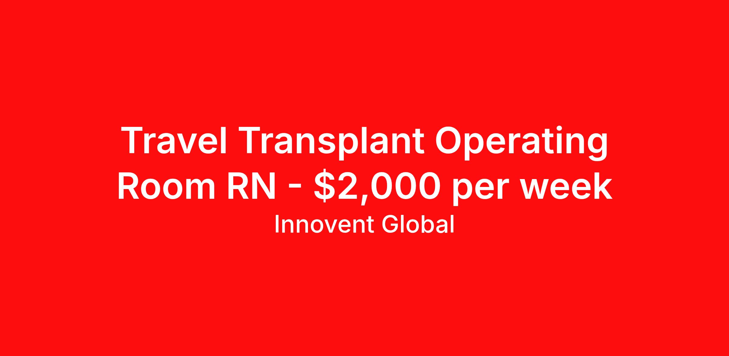 Innovent Global is seeking a travel nurse RN OR - Operating Room for a travel nursing job in Weston, Florida. Job Description & Requirements Specialty: OR - Operating Room Discipline: RN Duration: 13 weeks 40 hours per week Shift: 10 hours, days Employment Type: Travel MUST HAVE STRONG LIVER, HEART, LUNG & KIDNEY TRANSPLANT EXPERIENCE Innovent Global Job ID 3418. Pay package is based on 10 hour shifts and 40 hours per week (subject to confirmation) with tax-free stipend amount to be determined. About Innovent Global Innovent Global is your trusted resource for discovering the best travel and permanent nursing jobs across the United States. Whether you’re looking for a change in scenery or you’re seeking a new opportunity, we are fully committed to helping you find the best fit for a new chapter in your career. Based out of West Palm Beach, FL, Innovent Global has quickly become a leader in healthcare staffing. With over 20 years of experience working in the field alongside healthcare professionals, we are uniquely equipped to help you find the right match for your career goals. We've earned the trust of hospitals nationwide by providing highly skilled, experienced, and professional nurses and allied healthcare professionals. Our dedicated team works around the clock to exceed client expectations and ensure the highest level of care. Team Approach Innovent Global is not one recruiter looking for a job for you. The Innovent team is comprised of many individuals all working together to make sure you receive the best possible staffing experience every time. From our recruiters who reach out with top job opportunities and manage your resumes, to our account managers who leverage strong hospital relationships for quick interviews, to our compliance managers who ensure your credentials are up to date, to our Director of Operations who provides continuous support as a nursing resource, and our housing department that secures the best accommodations in your assignment area—the Innovent Team works together as a united front to deliver the best possible healthcare staffing experience Benefits - Insurance benefits (Health, Dental & Vision) - License and Certification Reimbursement - Weekly Pay - Referral Bonus - Large Network of Healthcare Facility's - 401k Retirement Savings Program for both full-time and part-time employees, with a wide range of investment options.