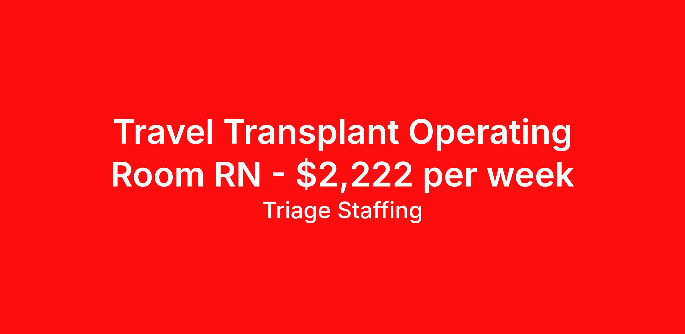 Triage Staffing is seeking a travel nurse RN OR - Operating Room for a travel nursing job in Weston, Florida. Job Description & Requirements Specialty: OR - Operating Room Discipline: RN Start Date: 04/20/2026 Duration: 13 weeks 40 hours per week Shift: 10 hours, days Employment Type: Travel Travel Nursing: OR Florida Location: Florida Start Date: 4/20/2026 Shift Details: 10H Days 40 hours per week Length: 13 WEEKS Apply for specific facility details.OR RN Triage Staffing Job ID RCRFPRHG. Posted job title: Registered Nurse Operating Room About Triage Staffing At Triage, we prefer to be real . Real about expectations—both ours and yours. Real about how a decision you make today could affect your tomorrows. Real about how compensation actually works. Real about how great—or grating—your next supervisor may be. Being real allows everyone at Triage to be ready . Ready to serve you with real honesty. So if that gig near the ocean is really no day at the beach, or that third shift comes with a second-class rate, we tell you. So you can be ready, too. We staff all five major divisions of acute care—nursing, lab, radiology, cardiopulmonary and rehab therapy, offering: - Competitive, custom pay packages - One point of contact for both travelers and facilities (per division) - A reliable recruiter who's got your back throughout your entire assignment - In-house compliance and accounting specialists - A clinical liaison team available 24/7 to offer medical and professional support and career development - A mentoring program that is run and managed by actual clinicians—yeah, you read that right - And more (because of course there’s more) Are we the biggest? No. Are we the best? That’s rather subjective, but we’re trying to be. Will we work like hell to get you as close to your idea of heaven as possible? Yes. Yes, we will. Benefits: Day One comprehensive, nationwide insurance plans for health, vision and dental and life—including a HSA option Day One 401(k) program with employer-matching contributions once eligible Facility cancelling protection—your time is money on and off-the-clock Guaranteed hours Weekly paychecks via direct deposit Earned vacation bonuses for time worked Paid holidays Employee assistance program (EAP)—your mental health is important, too Continuing education, certification and licensing reimbursement Workers comp—because accidents happen Top-rated professional liability insurance Company provided housing options Referral bonus—$750 in your pocket after they’ve completed a 13-week assignment