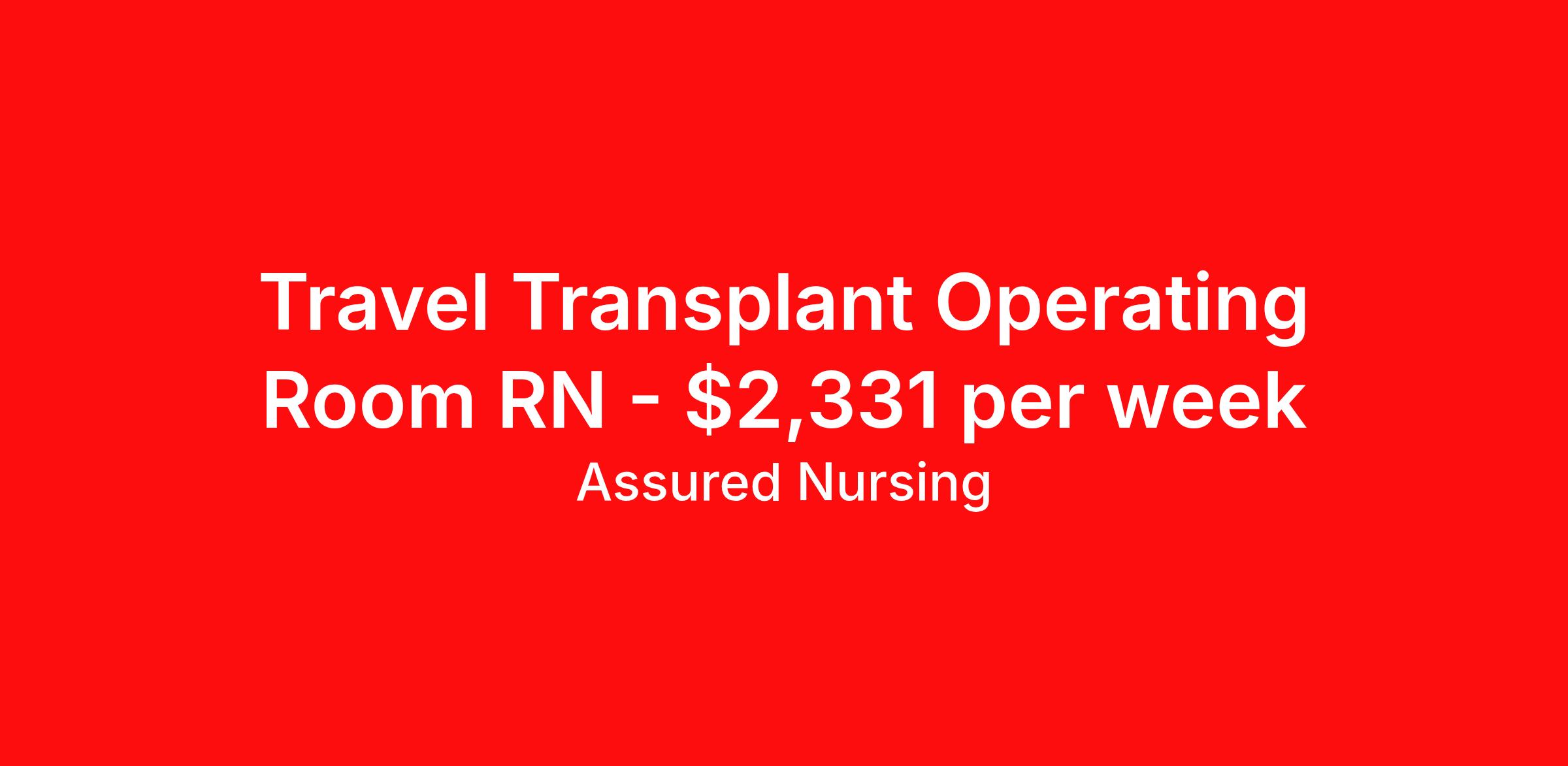 Assured Nursing is seeking a travel nurse RN OR - Operating Room for a travel nursing job in Weston, Florida. Job Description & Requirements Specialty: OR - Operating Room Discipline: RN Start Date: 04/20/2026 Duration: 13 weeks 40 hours per week Shift: 10 hours, days Employment Type: Travel Assured Nursing is currently seeking a RN for a contract position in Weston Florida . This is a 6a-4p, 06:00:00-16:00:00, 10.00-4 position in the Operating Room, 3050-3001-33018-TRANSPLANT-RN . The ideal candidate will possess a current state license as a RN and have at least 2 years of recent experience as a OR RN . Assured Nursing Job ID 35738512. Pay package is based on 10 hour shifts and 40.0 hours per week (subject to confirmation) with tax-free stipend amount to be determined. Posted job title: RN:OR,06:00:00-16:00:00 Benefits Weekly pay Holiday Pay 401k retirement plan Referral bonus Medical benefits Dental benefits Vision benefits