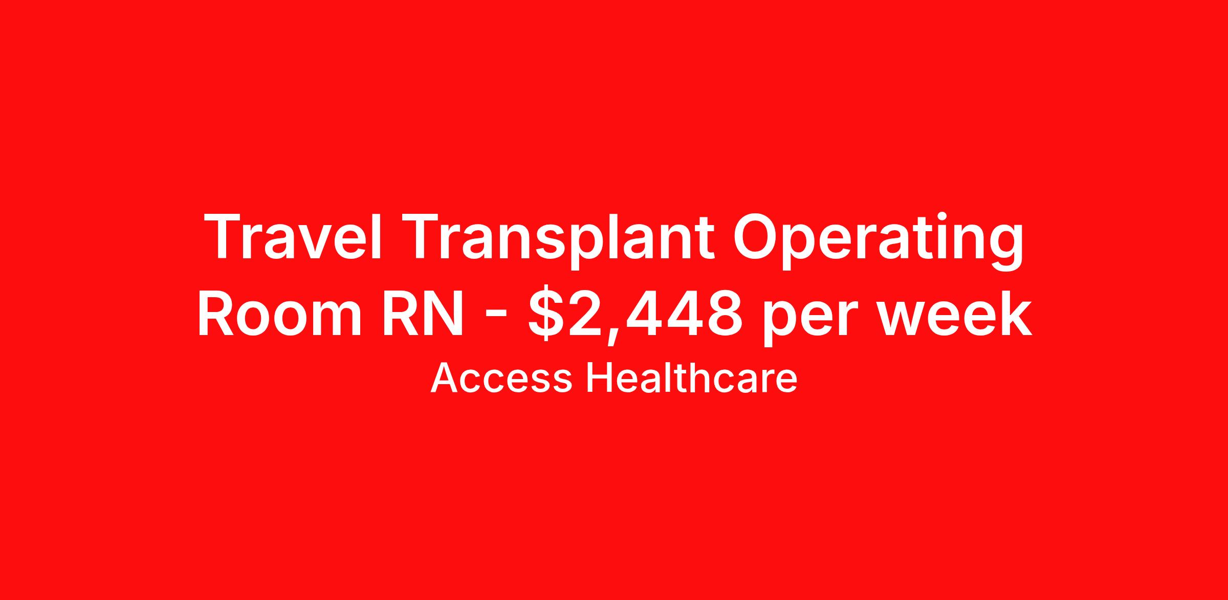 Access Healthcare is seeking a travel nurse RN OR - Operating Room for a travel nursing job in Weston, Florida. Job Description & Requirements Specialty: OR - Operating Room Discipline: RN Start Date: 04/20/2026 Duration: 13 weeks 40 hours per week Shift: 10 hours, days Employment Type: Travel Access Healthcare Job ID 74148980. Pay package is based on 10 hour shifts and 40 hours per week (subject to confirmation) with tax-free stipend amount to be determined. About Access Healthcare Access Healthcare aims to provide superior service to our nursing family by providing around the clock support, competitive pay packages and an unmatched benefits package! Unlike other agencies, we offer a true family feel and work with you to find the placement that is right for you. We offer one of the top leading pay packages in the industry and we are ready to get you the money you deserve! Access Healthcare was founded by two travel nurses, Danielle and Diego, who had a dream and a shared vision of creating an agency which all nurses would want to work with. Our passion has led us to where we are today as one of the top 10 agencies in our home state of New Jersey, with access to contracts in all 50 states! We encourage you to join our team and we cannot wait to get to know you!