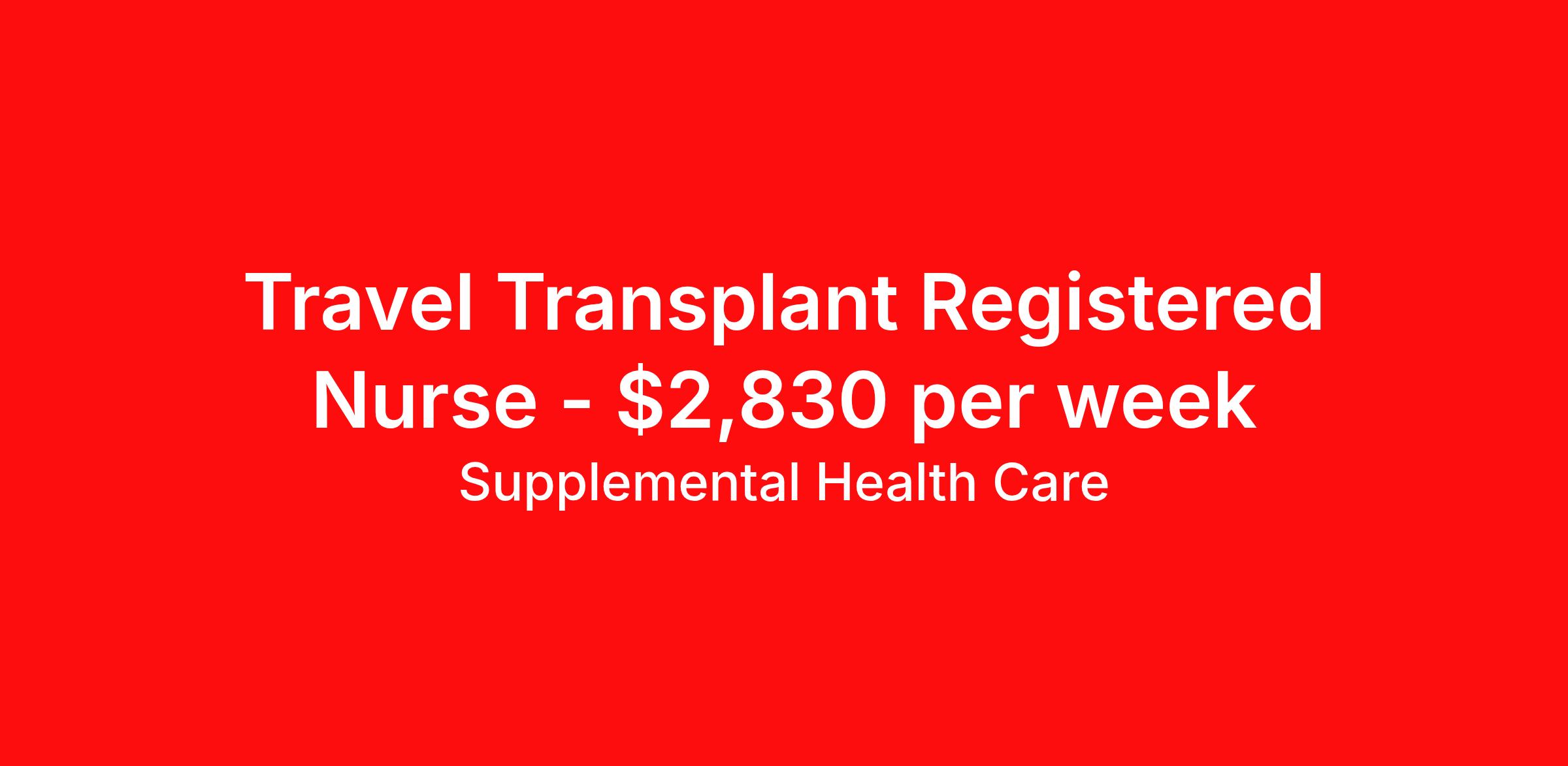 Supplemental Health Care is seeking a travel nurse RN Transplant for a travel nursing job in Boston, Massachusetts. Job Description & Requirements Specialty: Transplant Discipline: RN Start Date: ASAP Duration: 13 weeks 40 hours per week Shift: 8 hours, days Employment Type: Travel Job Description: Supplemental Health Care is connecting Transplant Registered Nurses with top-tier hospital contracts in Boston, Massachusetts. Travel or stay local, either way, we’ll guide you to an opportunity that matches your goals, offering excellent pay, benefits, and support. Qualifications: Current Massachusetts Registered Nurse License / Certification American Heart Association BLS 1 to 2 years of recent Transplant experience Transplant Registered Nurse Contract Details: $2,520 - $2,830 per week* Weekly pay 13-week contract with possibility to extend AM shifts available *Estimated weekly payment may include both taxable wages and tax-free reimbursements for meals, housing, and incidentals. Please speak with a recruiter for details. What We Offer: Full medical, dental, vision, life, and even pet insurance! Round the clock support. No matter where you are or what time it is, Supplemental Health Care is standing by. SHC's Share the Care referral program is the most dynamic, profitable referral program in the industry. 401(k) Retirement Savings Program with a wide range of investment options. Discounted and free online access to CEU courses through Supplemental University. Apply now to launch your next Transplant Registered Nurse assignment, or ask our team about other exciting Registered Nurse opportunities. Supplemental Health Care is an Equal Opportunity Employer. All candidates, including veterans and those with disabilities, are encouraged to apply. SHC will consider for employment qualified applicants with criminal histories in a manner consistent with the requirements of applicable local, state, or federal law. To learn more, visit www.shccares.com/eeo Supplemental Health Care Job ID 1466512. Pay package is based on 8 hour shifts and 40 hours per week (subject to confirmation) with tax-free stipend amount to be determined. Posted job title: Transplant Registered Nurse About Supplemental Health Care At Supplemental Health Care, a simple belief in the power of caring guides a unique commitment to world-class service in healthcare staffing. For 40 years, we’ve supported talented professionals pursuing their life calling in hospitals, schools, home health, corrections, behavioral health, and other settings. At SHC, we inspire vital connections and enrich lives and inspire better outcomes. As recipients of the Best in Staffing Awards for both Client and Talent, Supplemental Health Care is proud to be among only 2% of staffing companies singled out for the distinction based on the real feedback of our employees and the clients we serve. SHC has also earned The Joint Commission’s Gold Seal of Approval and is named among the Largest Health Care Staffing companies in the United States by Staffing Industry Analysts. We are also thrilled to recognize our very own SLP, Dr. Kelly Byrd as the American Staffing Association 2024 National Staffing Employee of the Year and Health Care Sector All-Star. We’re honored to connect Dr. Byrd to employment, share her incredible story, and support her family literacy nonprofit. For everyone that we serve, SHC is the place where caring hearts thrive. Benefits Referral bonus Benefits start day 1 401k retirement plan Continuing Education Discount program Health savings account