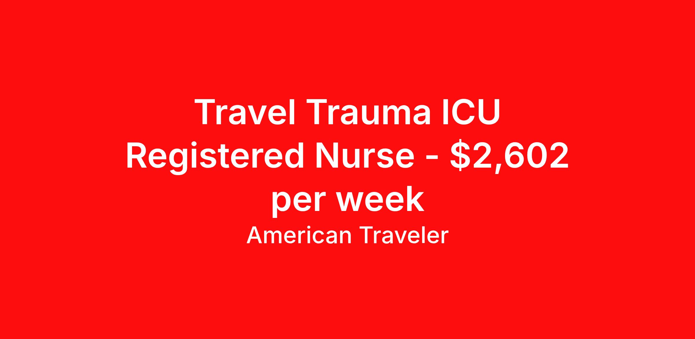 American Traveler is seeking a travel nurse RN Trauma ICU for a travel nursing job in Oklahoma City, Oklahoma. Job Description & Requirements Specialty: Trauma ICU Discipline: RN Start Date: 04/06/2026 Duration: 13 weeks 36 hours per week Shift: 12 hours, nights Employment Type: Travel Assignment Overview Shift: Nights, 3x12hrs Hours: 36 hrs/wk Start Date: Apr 6, 2026 Length: 13 weeks Openings: 1 Description American Traveler is hiring a travel RN for a Trauma ICU position requiring at least 1 year of Level 1 Trauma ICU experience and cardiac experience, working night shifts on a 13-week contract. Details Trauma ICU setting within a hospital environment Level 1 Trauma ICU patient population with complex, critically ill cases Night shift schedule, 3 days per week, 12-hour shifts (36 hours per week) Cardiac experience required as part of daily patient care responsibilities Requirements Active RN license issued by the Oklahoma State Board of Nursing or a current multistate compact (eNLC) RN license Current BLS and ACLS certifications, both issued by the American Heart Association (AHA) Minimum 1 year of RN experience, specifically in an ICU at a Level 1 Trauma facility Minimum 1 year of travel nursing experience required Cardiac nursing experience required Associate's Degree in Nursing (ADN) from an accredited program required; BSN preferred Full date of birth (DOB) required for consideration Additional Information Responsibilities include managing assigned patient groups, documenting nursing interventions and treatment responses, administering medications, and monitoring physiological data Collaborates with physicians during examinations and minor diagnostic procedures, and coordinates care with support staff through delegation Educates patients and families on care plans, hospital procedures, and discharge planning All certifications must be issued by the American Heart Association (AHA) Candidates must reside more than 50 miles from the facility to be eligible — local candidates will not be considered Travelers who have previously worked at this facility may only extend one time for a maximum of 26 total weeks; a 6-month separation period is required before becoming eligible for a new contract after that This facility enforces strict compliance deadlines — candidates should be prepared to begin onboarding (drug screens, background checks, medical requirements) immediately upon acceptance American Traveler Job ID P-681889. Pay package is based on 12 hour shifts and 36 hours per week (subject to confirmation) with tax-free stipend amount to be determined. Posted job title: Travel RN - Trauma ICU About American Traveler With over 25 years of experience, American Traveler has established a reputation for outstanding customer service. Our team ensures a smooth, worry-free experience for those starting on or expanding their travel nursing and allied careers. With thousands of travel nursing and allied jobs nationwide, our attentive and approachable recruiters find positions that align perfectly with your career aspirations and personal requirements. American Traveler offers exceptional benefits, including premium medical, dental, vision and life insurance beginning day one of your assignment, generous 401(k) match, substantial housing stipends, and more. Additionally, with 24/7 support and access to our in-house clinicians, you are assured confidence and comfort throughout your assignment. With our team behind you, you can relax and enjoy a rewarding travel career.