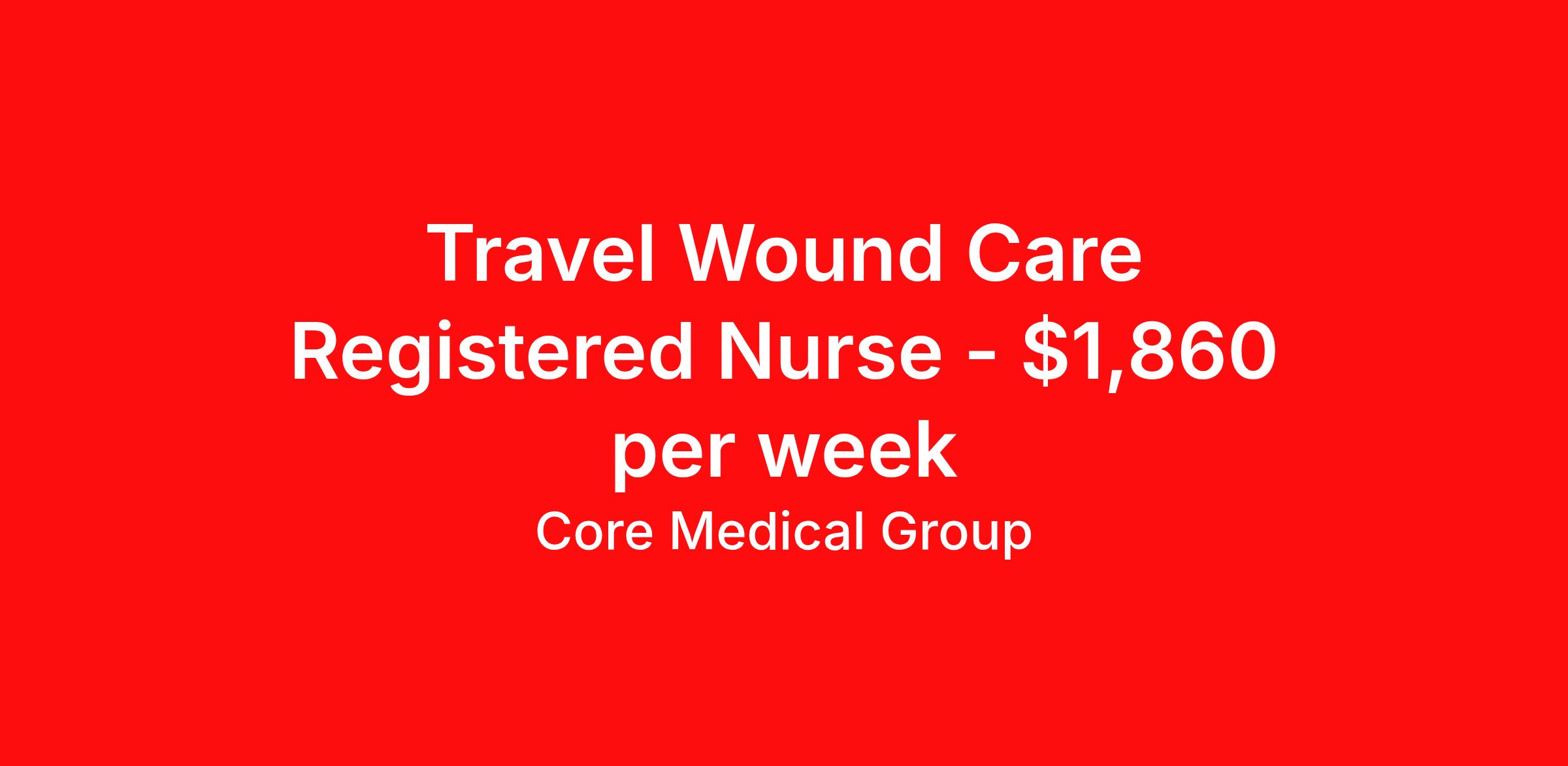 Core Medical Group is seeking a travel nurse RN Wound Care for a travel nursing job in Tucson, Arizona. Job Description & Requirements Specialty: Wound Care Discipline: RN Start Date: 04/06/2026 Duration: 13 weeks 36 hours per week Shift: 12 hours Employment Type: Travel Client in AZ seeking Registered Nurse: Wound Care for the following shift(s): Days We are looking for a healthcare professional who is ready to provide exceptional patient care in this contract/travel role. Contract/travel assignments are typically 13 weeks, with potential to extend. Help us continue our mission to connect people, improve lives, and give back to the community by joining the CoreMedical Group team. When you work with CoreMedical Group, we put you first and treat you like family, supporting you every step of the way. CoreMedical Group is one of the largest healthcare staffing agencies in the country, with travel and contract positions located across the United States. Our recruiters will help you find the perfect job, whether it's across the country or across the street. In addition to dedicated, personalized support from your recruiter, when you work with CoreMedical Group you'll receive: Access to an extensive benefits package, including day 1 health, dental, and vision insurance, employer paid life insurance, a health reimbursement account, and more! Weekly paychecks with competitive pay packages Matching 401(k) benefits to help you save for retirement Licensure assistance and reimbursement to set you up for success on your contract Travel reimbursement and dedicated housing support while on assignment Referral cash bonuses when you connect us with other clinicians CoreMedical Group also offers you a free, all-inclusive vacation each year as our way of saying "thank you" for your hard work. Join other healthcare professionals on the annual Club CoreMed retreat and you'll see why our contract and travel professionals come back to us year after year! Your career is too valuable to tackle on your own. Let CoreMedical Group help you with your healthcare journey! *Estimate of weekly payments is intended for informational purposes and includes hourly wages, as well as reimbursements for meal & incidental expenses, and housing expenses incurred on behalf of the Company. Any benefits (medical/dental/vision) are in addition to the weekly pay. Please speak with your Recruiter for additional details. Estimated payments are subject to change until formal offer of assignment is made and accepted. Core Medical Group Job ID 1357213. Pay package is based on 12 hour shifts and 36 hours per week (subject to confirmation) with tax-free stipend amount to be determined. Posted job title: RN About Core Medical Group CoreMedical Group is one of the largest healthcare staffing agencies in the country. We have jobs nationwide in travel nursing, travel allied health, interim, locum tenens, and permanent placements! Join the staffing agency with Club CoreMed, the best perk in the industry - an all inclusive paid trip to a tropical resort! Benefits Weekly pay Holiday Pay Guaranteed Hours Continuing Education 401k retirement plan Pet insurance Company provided housing options Sick pay Wellness and fitness programs Mileage reimbursement Referral bonus Employee assistance programs Medical benefits Dental benefits Vision benefits Benefits start day 1 License and certification reimbursement Life insurance Discount program