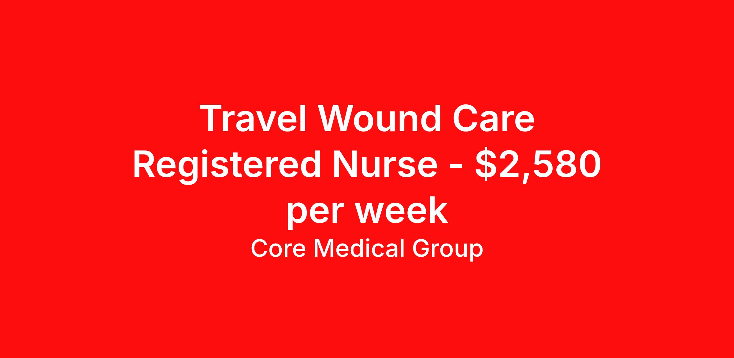 Core Medical Group is seeking a travel nurse RN Wound Care for a travel nursing job in New York, New York. Job Description & Requirements Specialty: Wound Care Discipline: RN Start Date: 04/13/2026 Duration: 13 weeks 40 hours per week Shift: 8 hours Employment Type: Travel Client in NY seeking Registered Nurse: Wound Care for the following shift(s): Days We are looking for a healthcare professional who is ready to provide exceptional patient care in this contract/travel role. Contract/travel assignments are typically 13 weeks, with potential to extend. Help us continue our mission to connect people, improve lives, and give back to the community by joining the CoreMedical Group team. When you work with CoreMedical Group, we put you first and treat you like family, supporting you every step of the way. CoreMedical Group is one of the largest healthcare staffing agencies in the country, with travel and contract positions located across the United States. Our recruiters will help you find the perfect job, whether it's across the country or across the street. In addition to dedicated, personalized support from your recruiter, when you work with CoreMedical Group you'll receive: Access to an extensive benefits package, including day 1 health, dental, and vision insurance, employer paid life insurance, a health reimbursement account, and more! Weekly paychecks with competitive pay packages Matching 401(k) benefits to help you save for retirement Licensure assistance and reimbursement to set you up for success on your contract Travel reimbursement and dedicated housing support while on assignment Referral cash bonuses when you connect us with other clinicians CoreMedical Group also offers you a free, all-inclusive vacation each year as our way of saying "thank you" for your hard work. Join other healthcare professionals on the annual Club CoreMed retreat and you'll see why our contract and travel professionals come back to us year after year! Your career is too valuable to tackle on your own. Let CoreMedical Group help you with your healthcare journey! *Estimate of weekly payments is intended for informational purposes and includes hourly wages, as well as reimbursements for meal & incidental expenses, and housing expenses incurred on behalf of the Company. Any benefits (medical/dental/vision) are in addition to the weekly pay. Please speak with your Recruiter for additional details. Estimated payments are subject to change until formal offer of assignment is made and accepted. Core Medical Group Job ID 1366381. Pay package is based on 8 hour shifts and 40 hours per week (subject to confirmation) with tax-free stipend amount to be determined. Posted job title: RN About Core Medical Group CoreMedical Group is one of the largest healthcare staffing agencies in the country. We have jobs nationwide in travel nursing, travel allied health, interim, locum tenens, and permanent placements! Join the staffing agency with Club CoreMed, the best perk in the industry - an all inclusive paid trip to a tropical resort! Benefits Weekly pay Holiday Pay Guaranteed Hours Continuing Education 401k retirement plan Pet insurance Company provided housing options Sick pay Wellness and fitness programs Mileage reimbursement Referral bonus Employee assistance programs Medical benefits Dental benefits Vision benefits Benefits start day 1 License and certification reimbursement Life insurance Discount program
