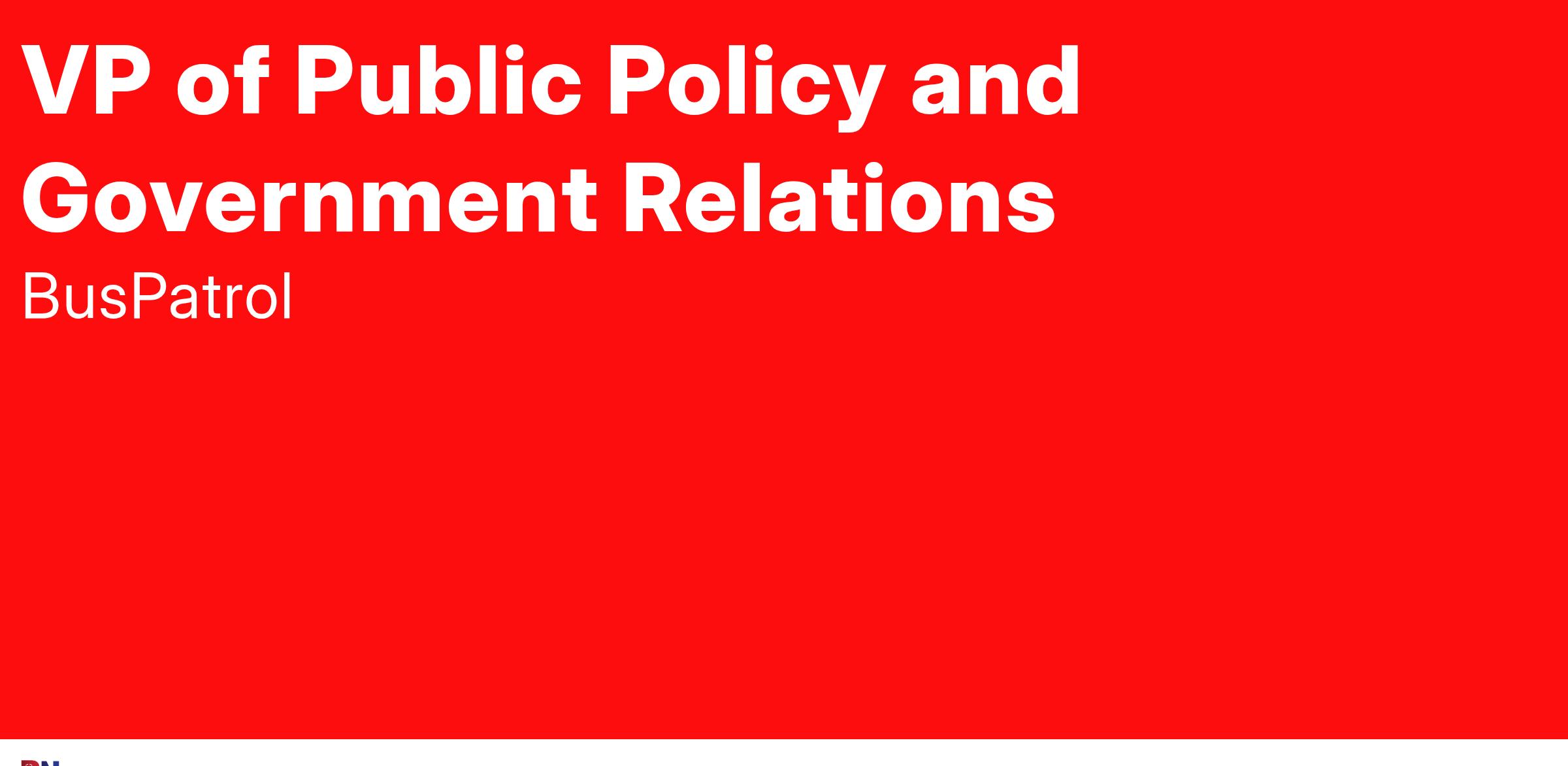 BusPatrol is seeking a sharp and savvy leader to join our team as Vice President of Public Policy and Government Relations. This role is ideal for someone who is a political strategy thought leader with superb writing and oral communication skills, impeccable research abilities, and a keen eye for detail concerning state and local laws. We are seeking a strong team leader who thrives in the dynamic world of public policy, coalition building, and communications strategy around leveraging technology to advance traffic safety causes. The VP will play a critical role in shaping legislation and advancing company business development to expand growth opportunities and safety impact. The VP will also serve a key conduit to our operations, technology/product, legal, implementation and account management teams around policy requirements and compliance. Lastly, the VP will serve at times as a public-facing evangelist for the company at conferences, on panels, and interviews with media concerning traffic safety and technology, and support white paper development to position and promote the quantitative safety impact of our programs.